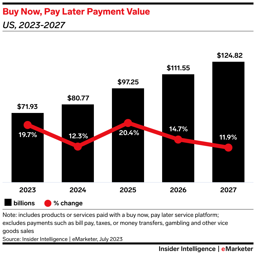 - Total BNPL payment value will reach $71.93 billion in the US this year and will skyrocket to $124.82 billion by 2026, according to our forecasts.