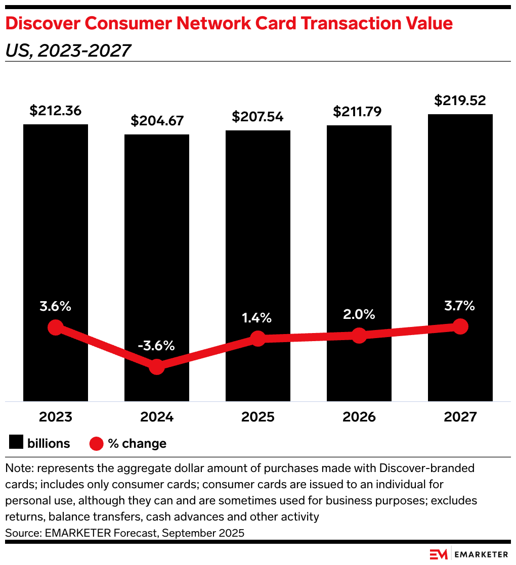 Capital One said it will finish moving its debit cards to Discover by early 2026. After that, it’s only a matter of time before it starts migrating credit cards. We forecast Discover’s consumer network card transaction value growth will more than double from 2025 to 2027. While its total volume is still an order of magnitude lower than that of Mastercard or Visa, those incremental gains will lead to real lost volume opportunities for the duopoly.