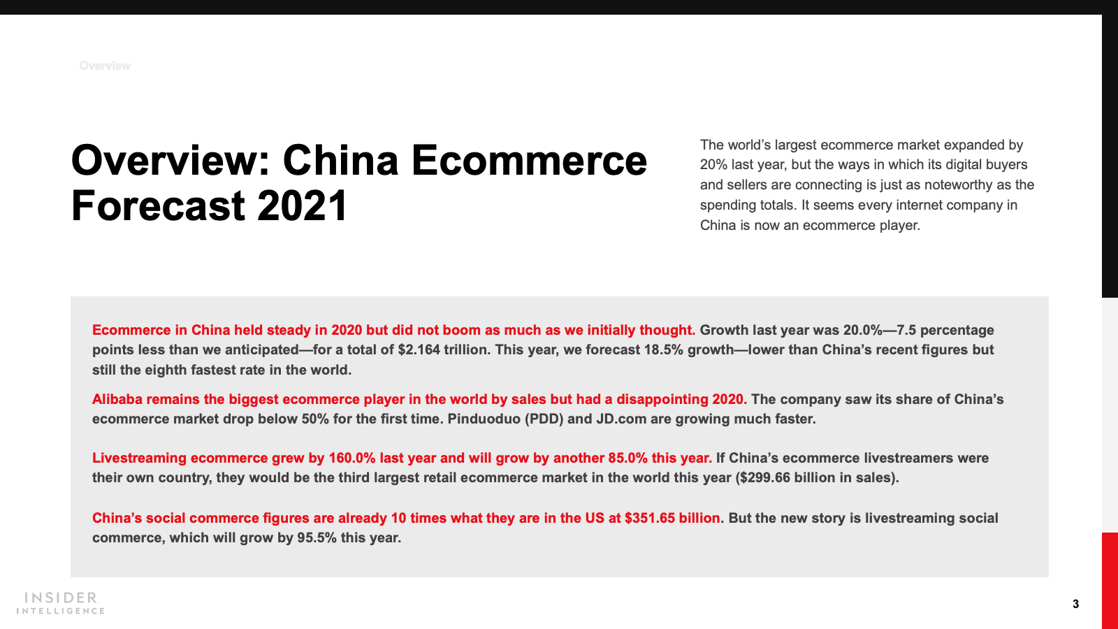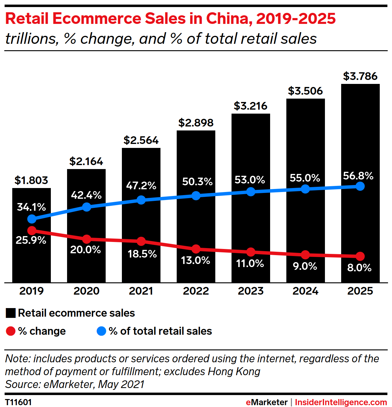 KEY STAT: Retail ecommerce sales in China increased by 20% last year, less than the 27.5% expansion we previously predicted. This year, we anticipate a continued deceleration, down to 18.5% growth.