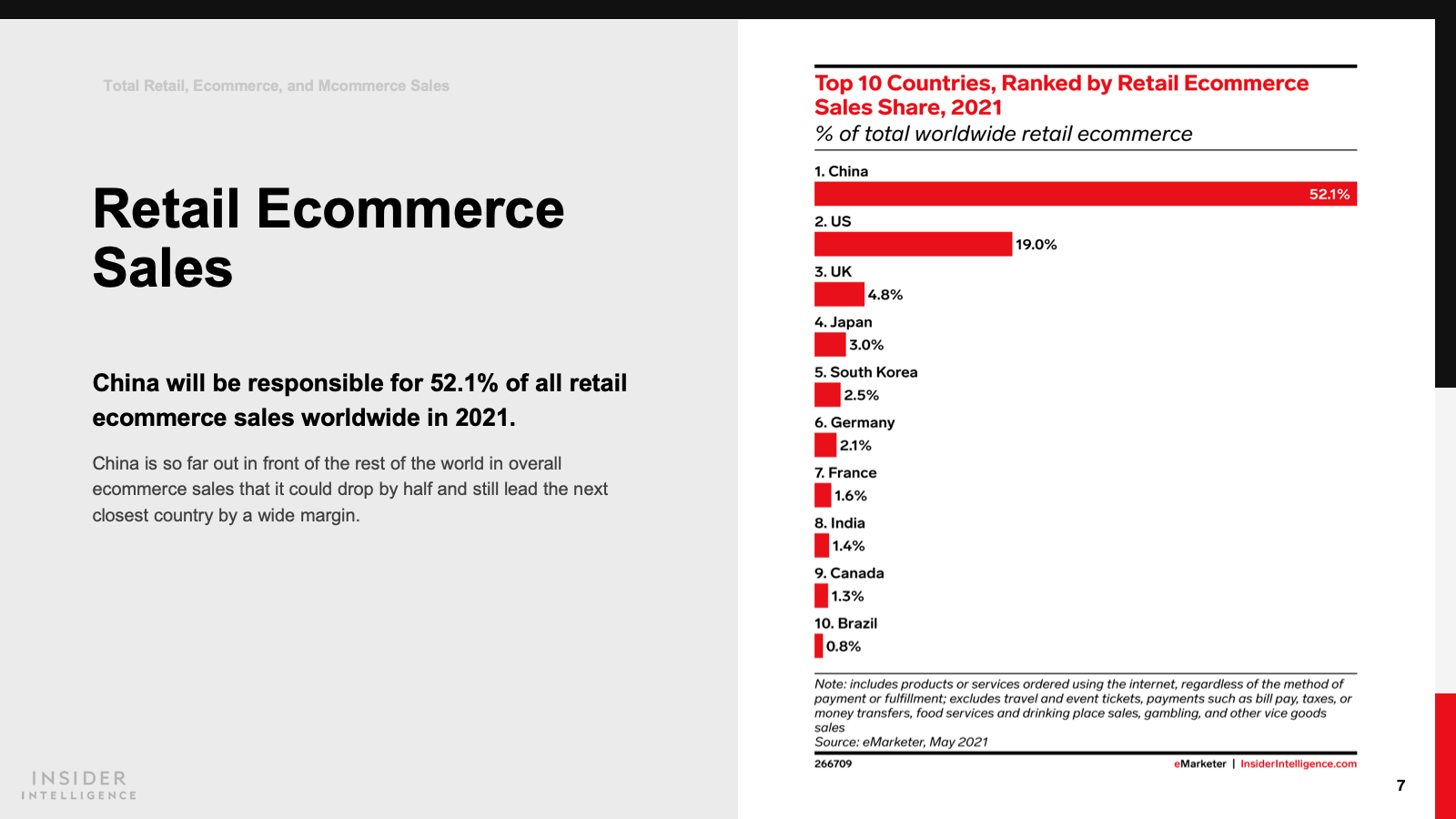 Ecommerce in China held steady in 2020 but did not boom as much as we initially thought. Growth last year was 20.0%—7.5 percentage points less than we anticipated—for a total of $2.164 trillion. This year, we forecast 18.5% growth, lower than China’s recent figures but still the eighth fastest rate in the world. China will continue to account for more than half of all ecommerce globally (52.1%).