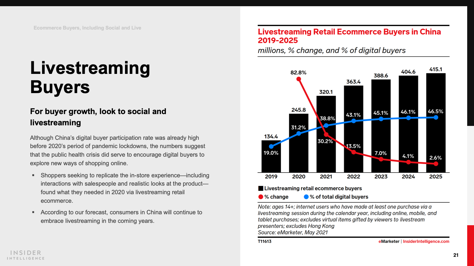 WHAT’S IN THIS REPORT? This report features our latest China forecasts for retail sales, retail sales by product category, retail ecommerce, mcommerce, social commerce, livestreaming commerce, livestreaming social commerce, digital buyers, and ecommerce by company.