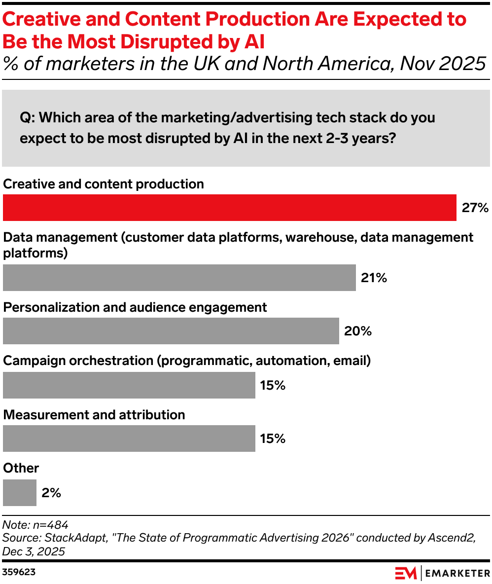 Key Stat: Some 27% of marketers say creative and content production will be the most disrupted area by AI—the top response among all functions.