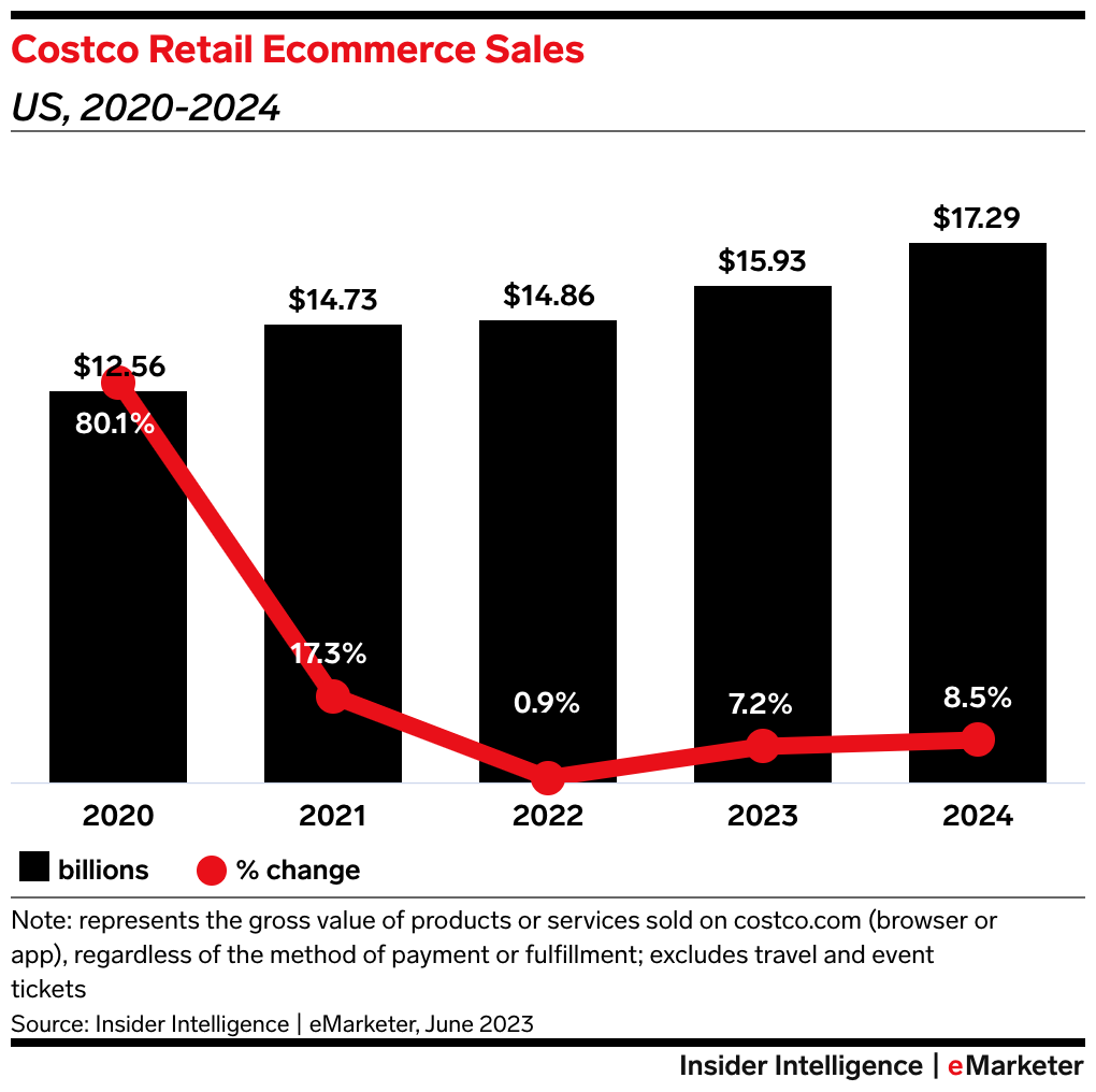 Looking ahead: Ecommerce accounts for a relatively small share of Costco’s overall revenues (our forecast expects it to generate $15.93 billion online this year, which is less than 10% of the $160.28 billion it generated in the first three quarters of this fiscal year).