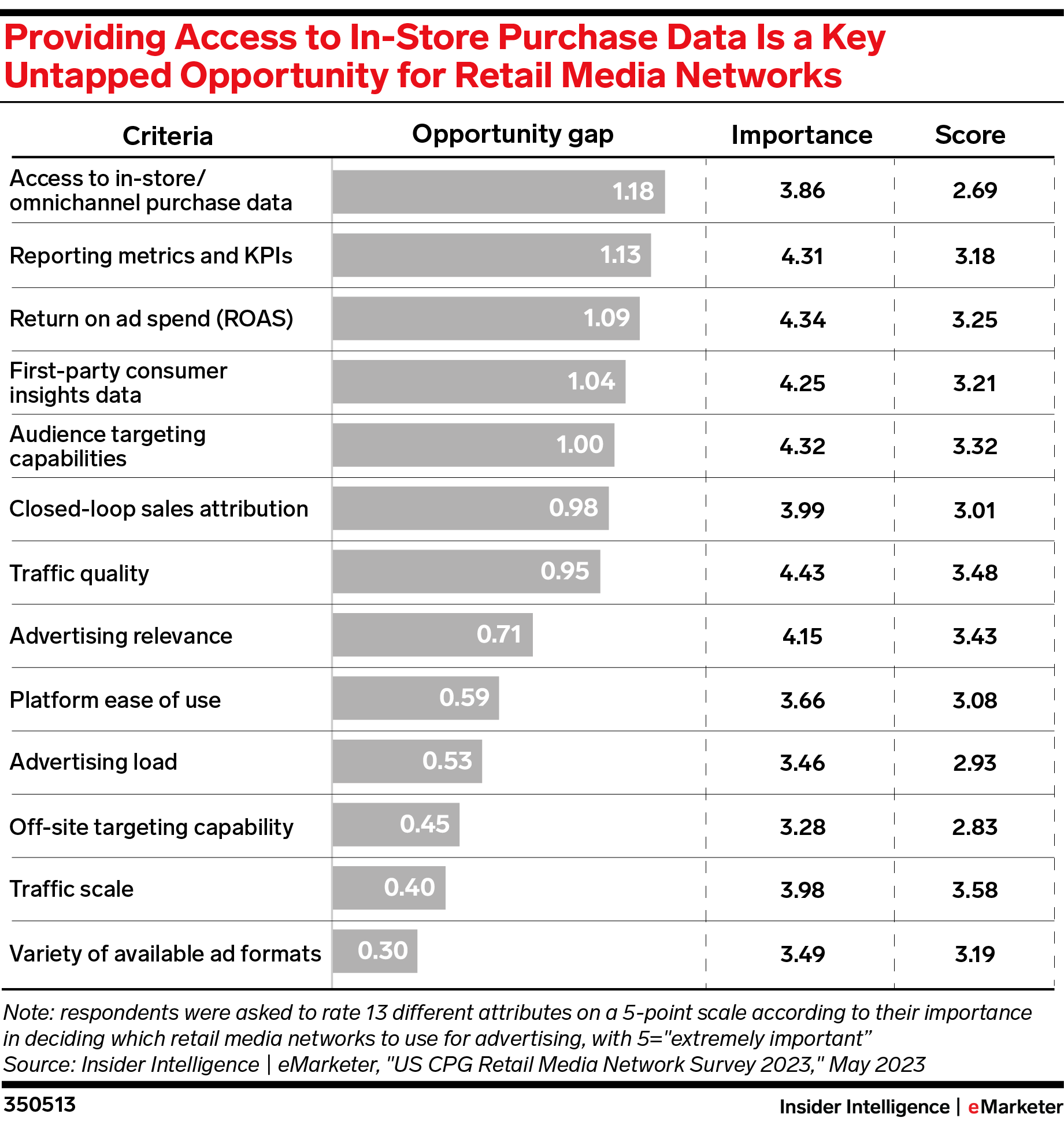 KEY STAT: CPG advertisers said traffic quality was the most important attribute in an RMN, with an average of 4.43 on a 5-point scale of importance—but the biggest opportunity gap for RMNs to address is with in-store/omnichannel purchase data.