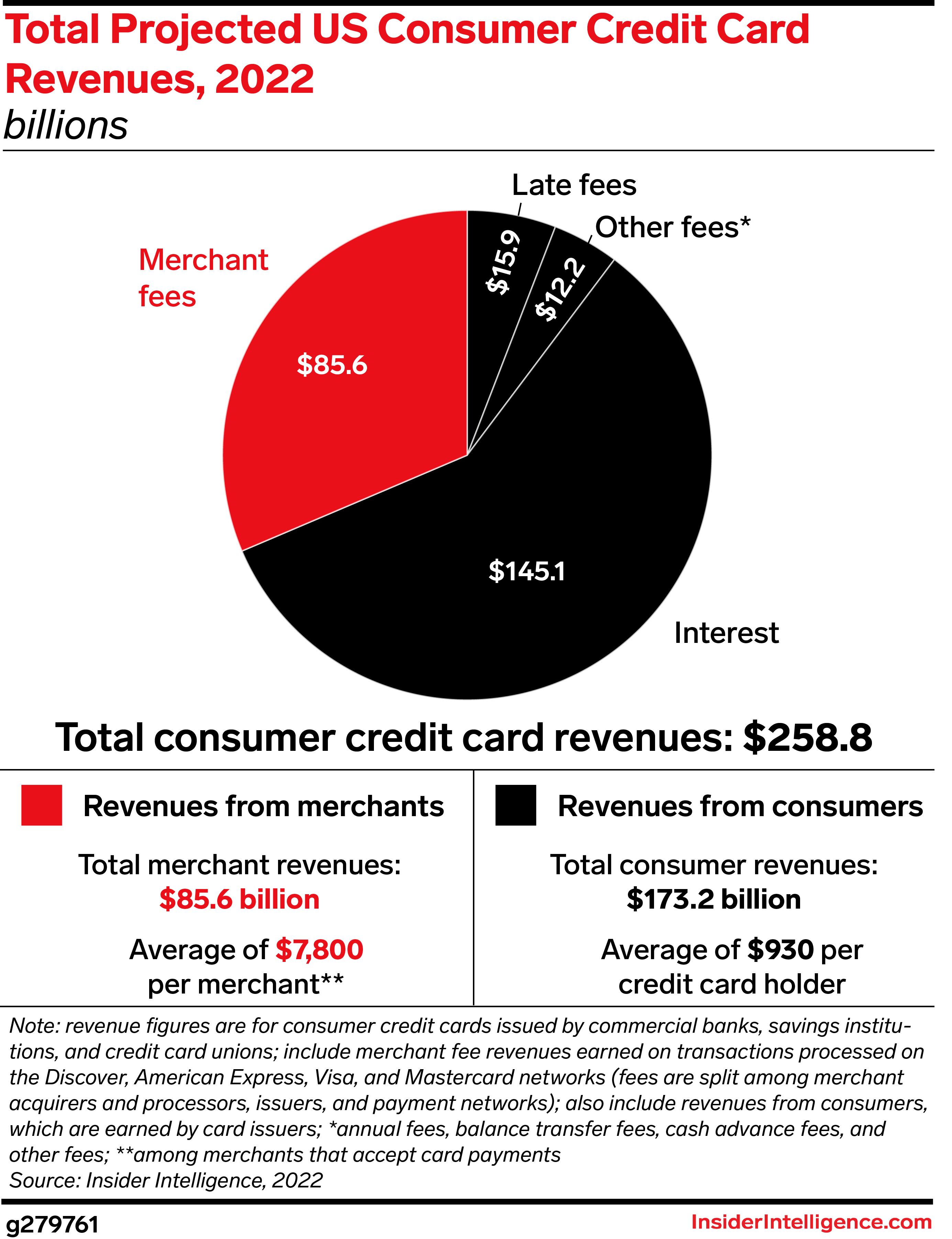 More than two-thirds of US consumer credit card revenues came from consumers themselves in 2022, per our estimates. Interest made up the biggest chunk at about 56% of total revenues.