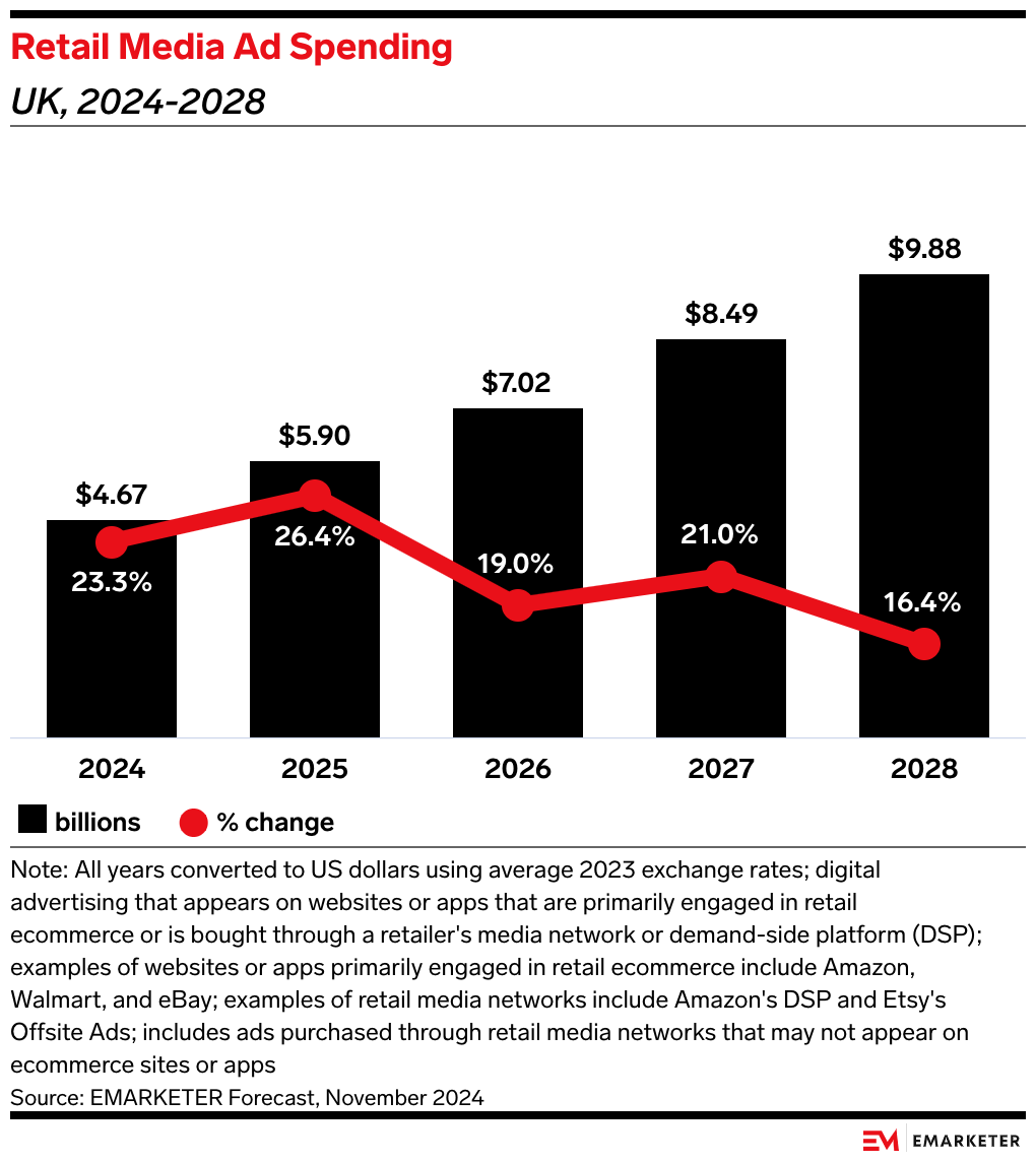 We expect UK retail media ad spending to jump 26.4% this year to $5.9 billion, although just 28.8% of those dollars will be allocated to companies other than Amazon.