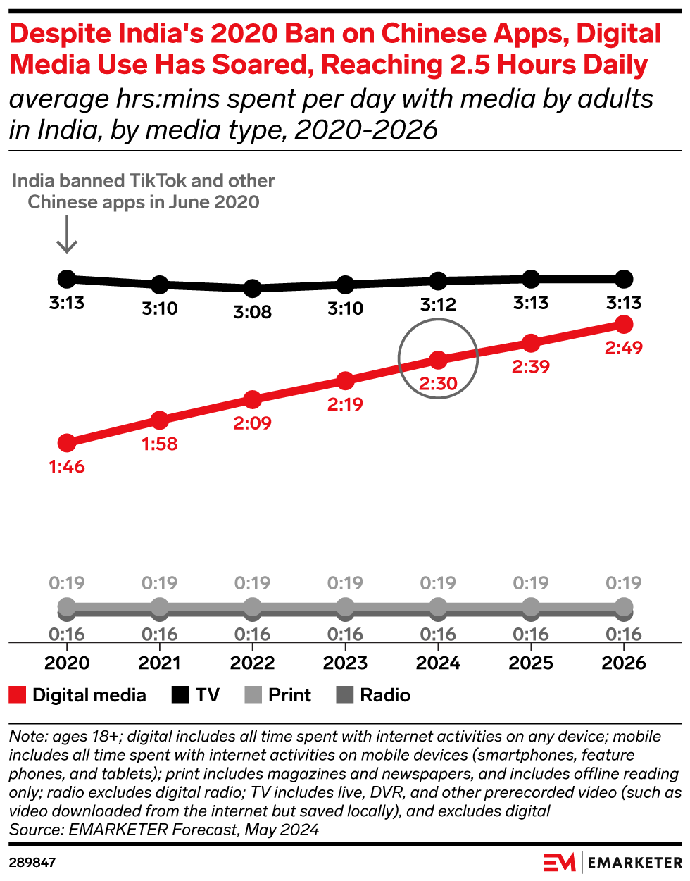 It’s difficult to estimate how many Chinese apps were operating in India at the time of the bans. Some of the prohibited services were well-known globally, including short-video apps TikTok and Kwai (also known as Kuaishou), AliExpress, Shein, WeChat, gaming app PUBG Mobile, Baidu, and UC Browser. But despite some public disappointment with the bans, time spent with digital media in India has climbed steadily since 2020, per our forecast.