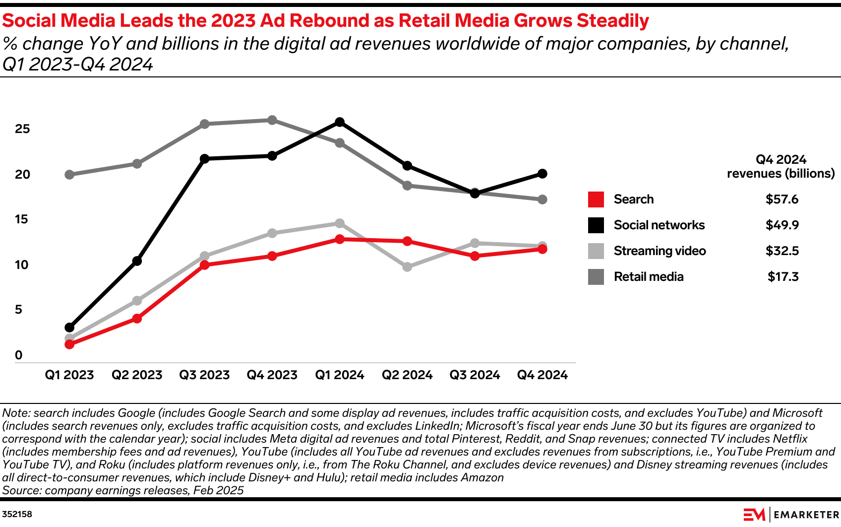 Q4 2024 earnings showed the digital advertising landscape undergoing a major shift driven by AI investments, search competition, and evolving consumer behaviors. Google and Microsoft are doubling down on AI-powered search and advertising, while social platforms vie for dominance in short-form video. Streaming services continue to lean into live sports and ad-supported tiers to sustain growth, and retail media remains the fastest-growing sector in digital advertising—though competition is intensifying.