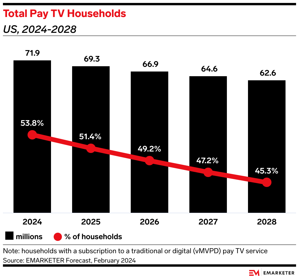 • There will be 71.9 million US pay TV households this year, per our forecast, falling to 69.3 million in 2025 and 62.6 million by 2028. That decline is why DirecTV has called this conflict an “existential” one—it will solidify the lines of power in the rapidly changing industry.