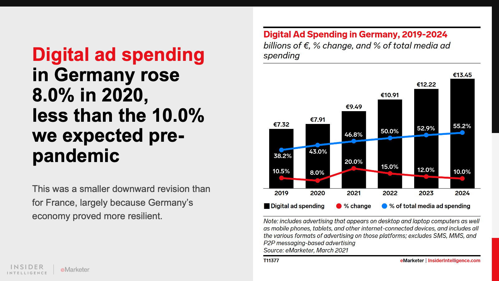 In Germany, as in France, digital ad spending growth was rather anemic in 2020, at 8.0%, compared with our pre-pandemic expectation of 10.0%. But it will recover dramatically this year. We’ve revised our 2021 estimate upward, from 9.0% to 20.0% YoY.