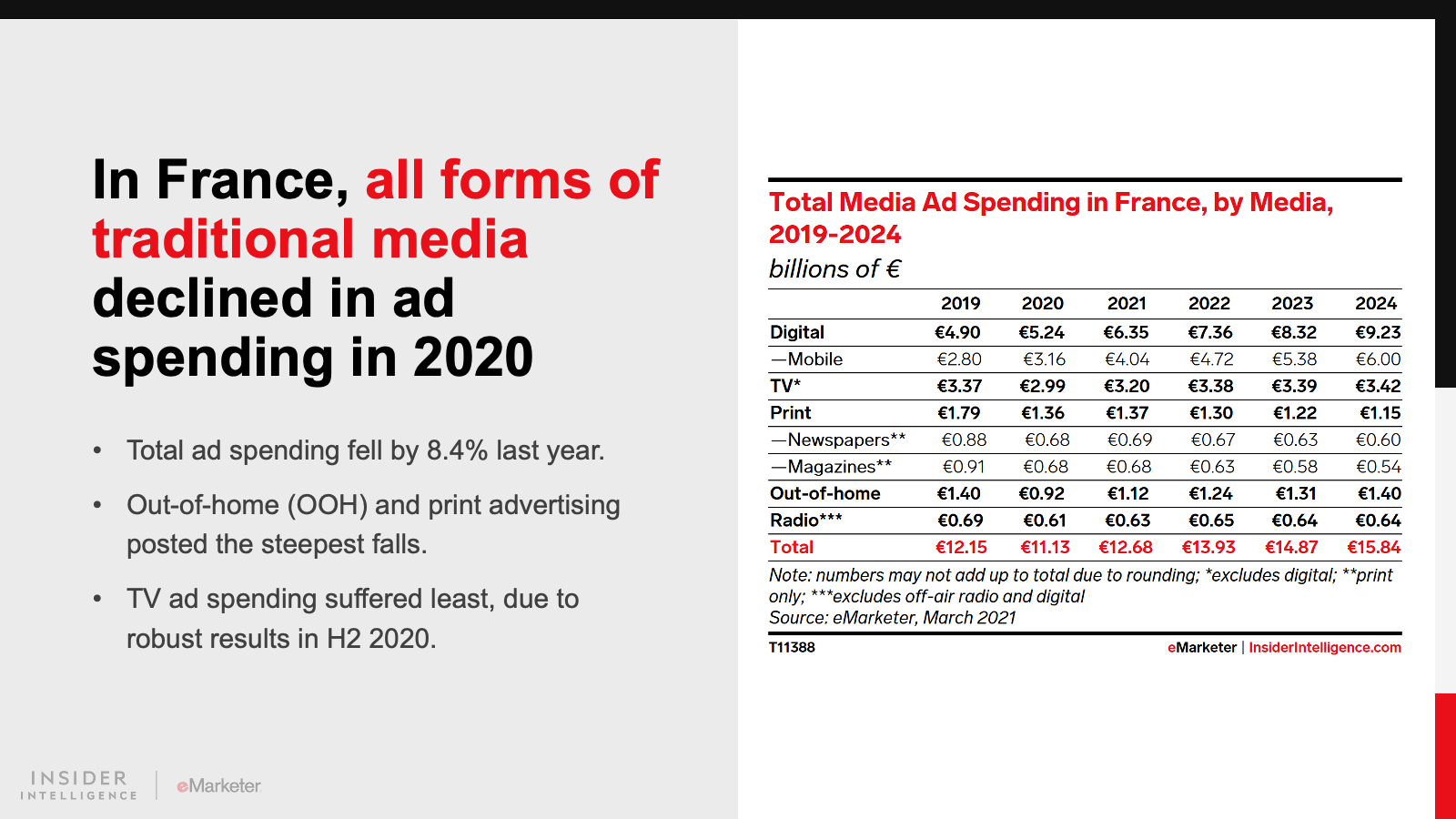 Ad spending on all measured media in Germany fell last year—though not as much as it did in France. In Germany, total ad spending slipped by 3.9% to €18.41 billion ($20.99 billion) in 2020. But it should rise by 10.2% to €20.28 billion ($23.12 billion) in 2021, as one of Europe’s most resilient economies regains momentum.