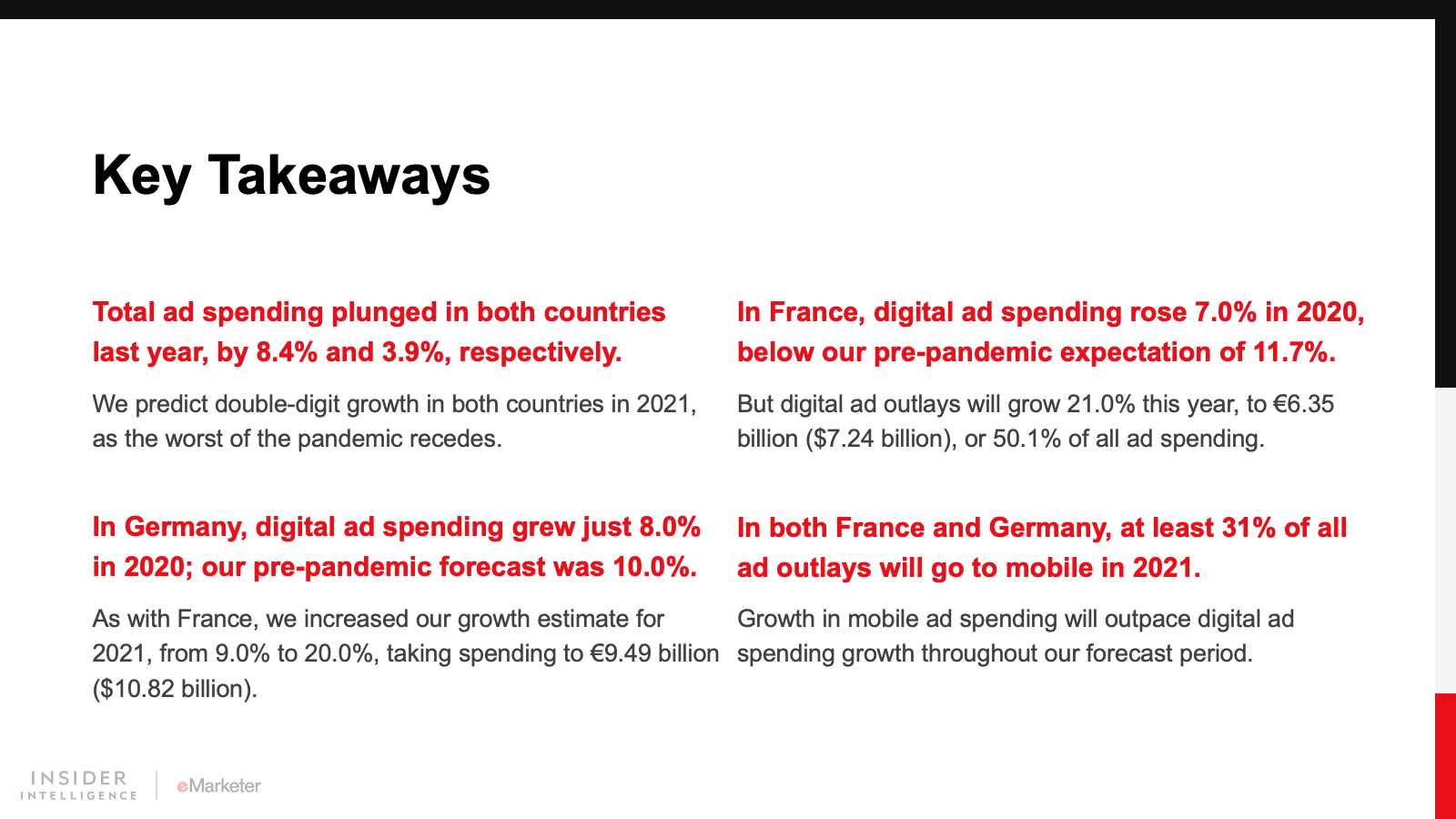 WHAT’S IN THIS REPORT? This report highlights our latest forecasts for ad spending in France and Germany, including on traditional, digital, and mobile media. It also looks at the pandemic’s impacts on ad spending in 2020 and 2021.