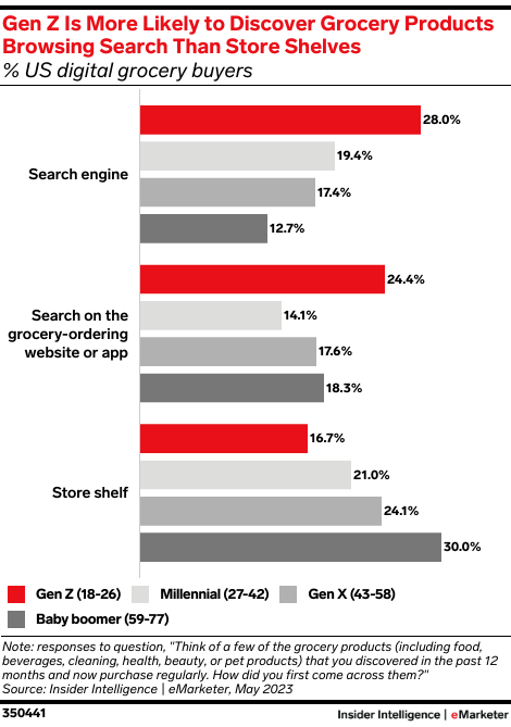 Key stat: 28.0% of Gen Z consumers have discovered grocery products via search engines, compared with 16.7% that have discovered products while browsing store shelves, per our forecast.
