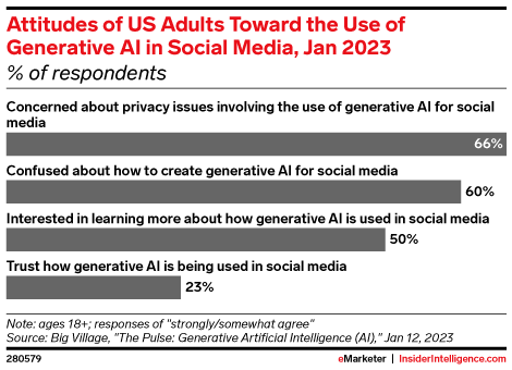 KEY STAT: Fewer than 25% of US adults trust how genAI is being used in social media, per January 2023 data from Big Village.