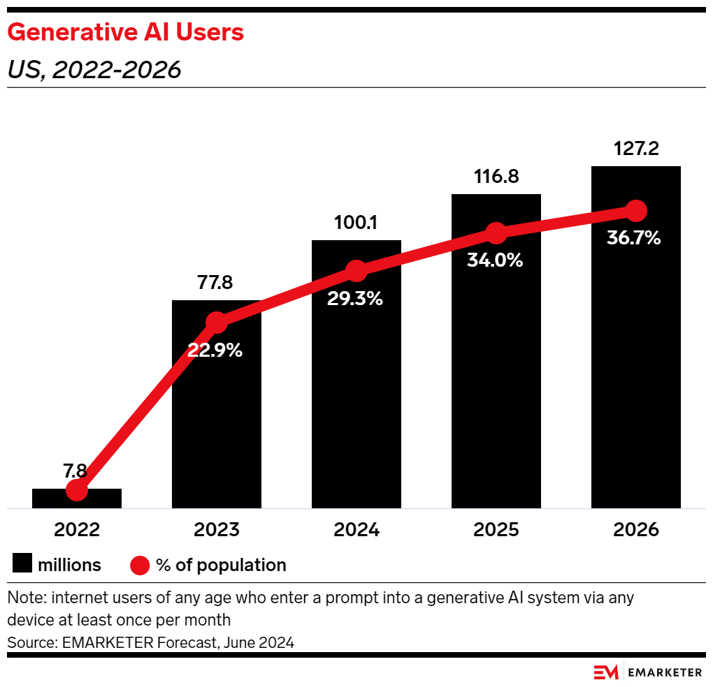 Key stat: This year 100.1 million people in the US will use generative AI at least once per month, up nearly 900% from 7.8 million in 2022, per our June 2024 forecast.