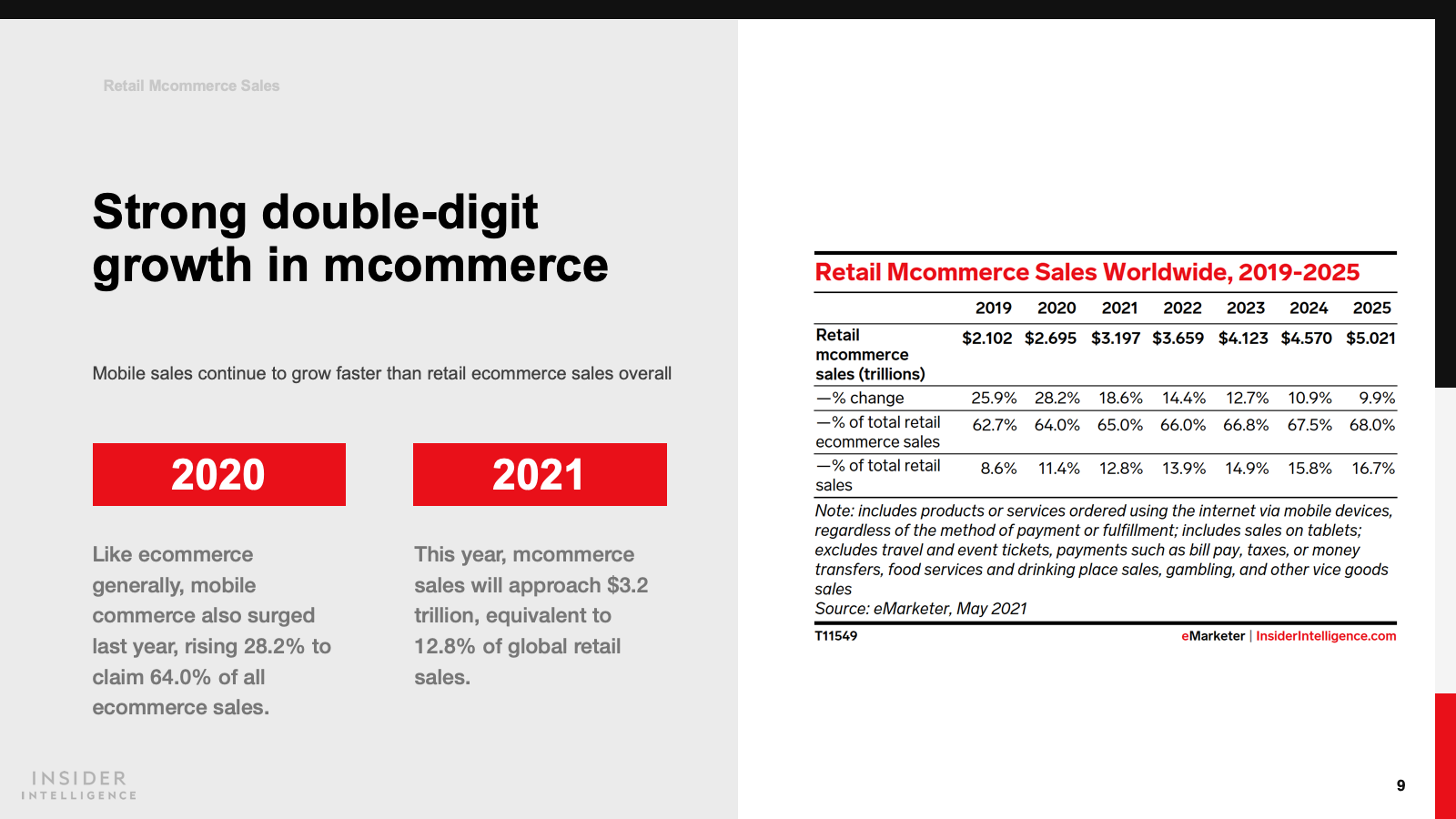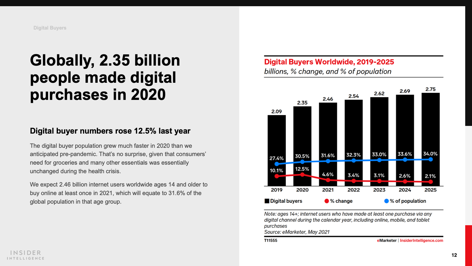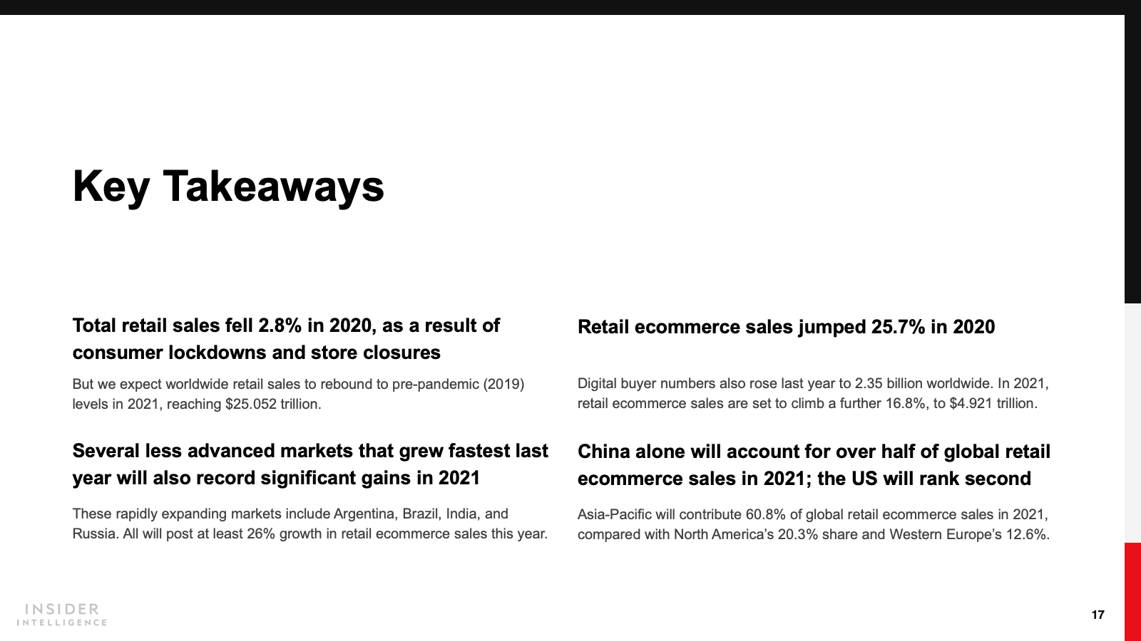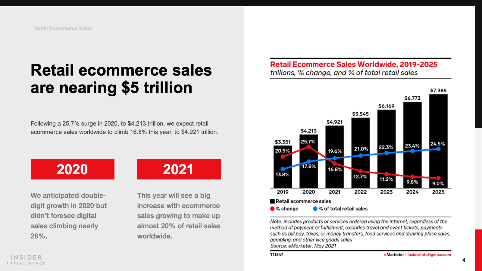KEY STAT: Following a 25.7% increase in 2020, retail ecommerce sales worldwide will rise to $4.921 trillion in 2021.