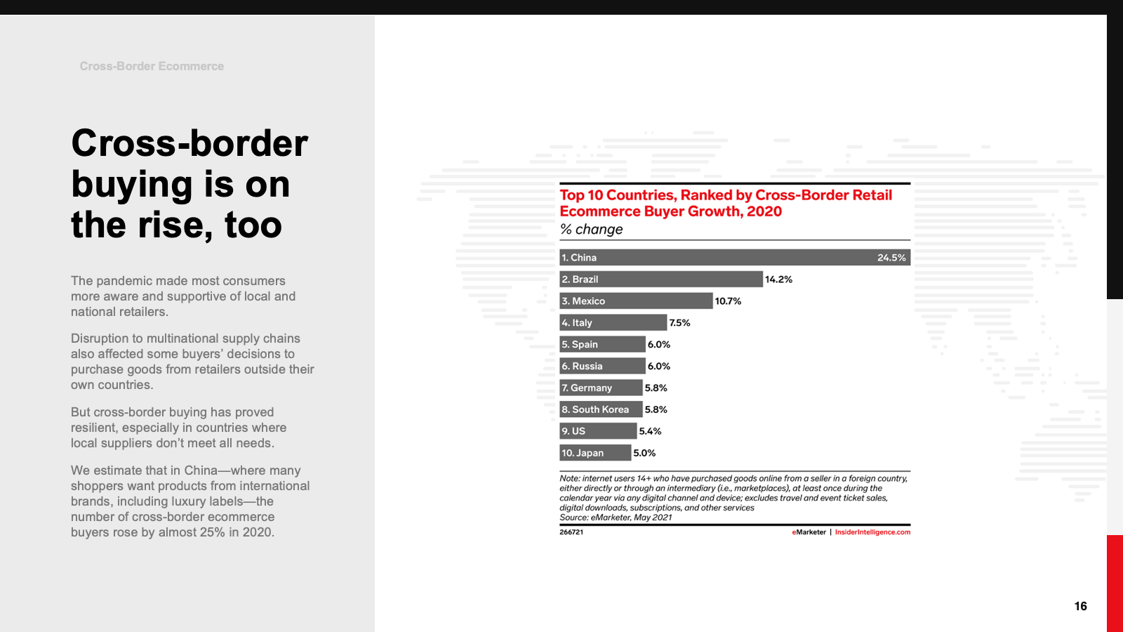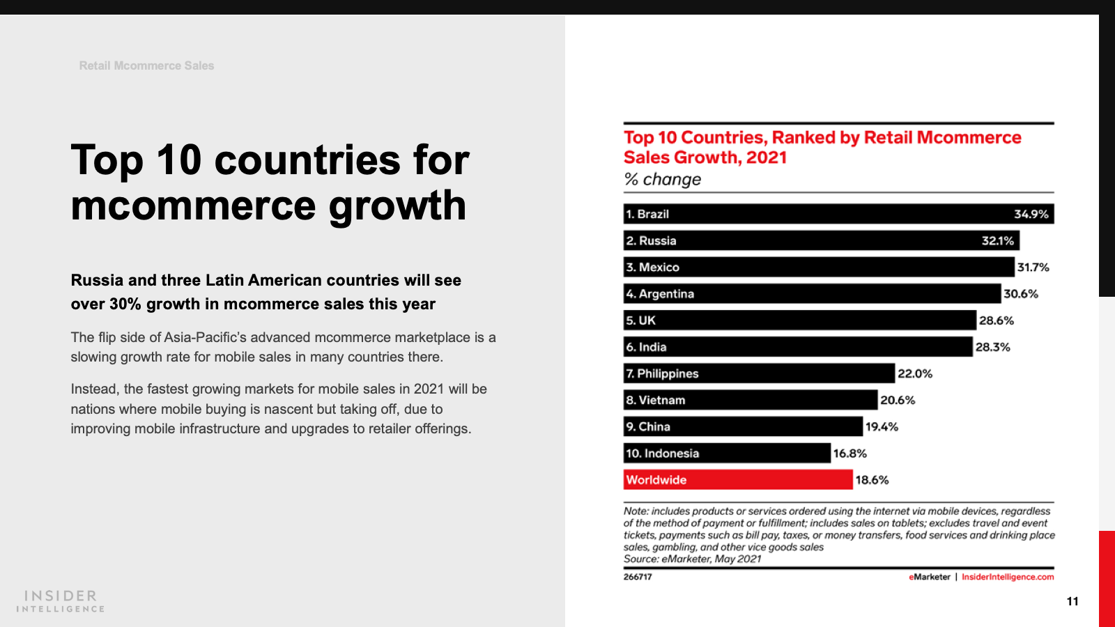 Last year, the pandemic fueled rapid acceleration of online buying in several countries that were somewhat lagging—and some of those will continue to see major expansion in 2021. India, Brazil, Russia, and Argentina are all projected to post at least 26% growth in retail ecommerce sales this year.