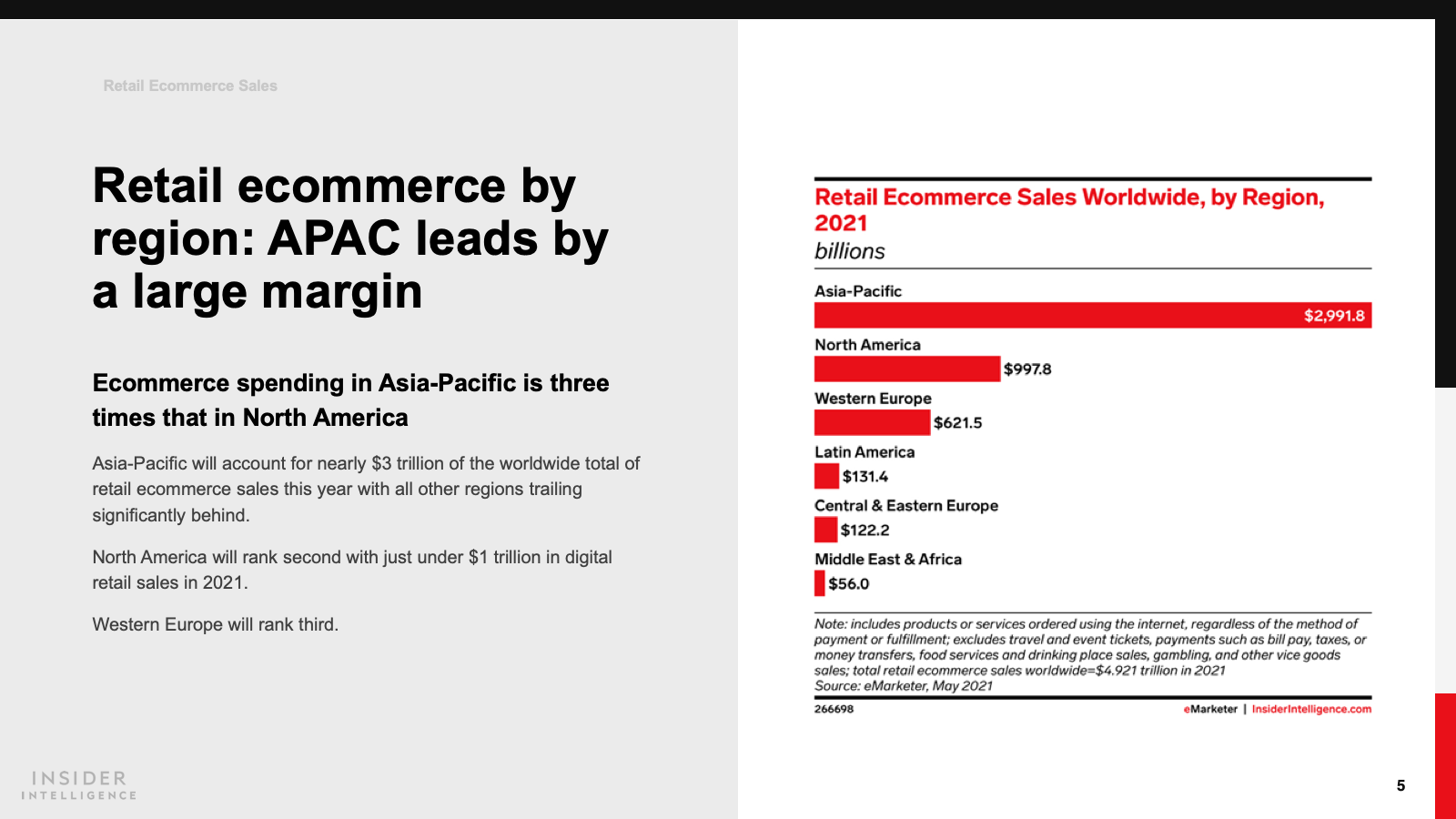 As in 2020, Asia-Pacific and North America will lead the regional rankings for retail ecommerce sales this year. China’s outsize role will mean that Asia-Pacific will account for 60.8% of retail ecommerce sales worldwide in 2021. North America will claim a 20.3% share, and Western Europe 12.6%.