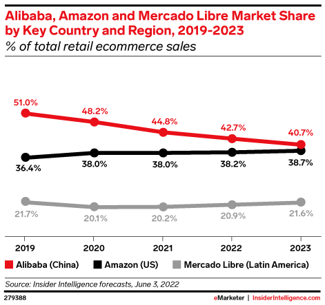 KEY STAT: By 2023, Alibaba and Amazon will have similar market shares in their respective home markets. Mercado Libre’s market share in all of Latin America will be just under 21% this year, but the share in its largest market, Brazil, will exceed 30%.