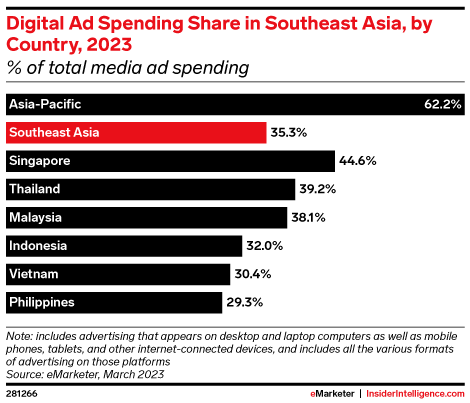 KEY STAT: Digital’s share of ad spending in Southeast Asia will reach only 35.3% of total ad spending in 2023, lagging far behind total Asia-Pacific.