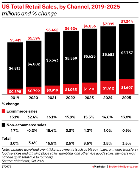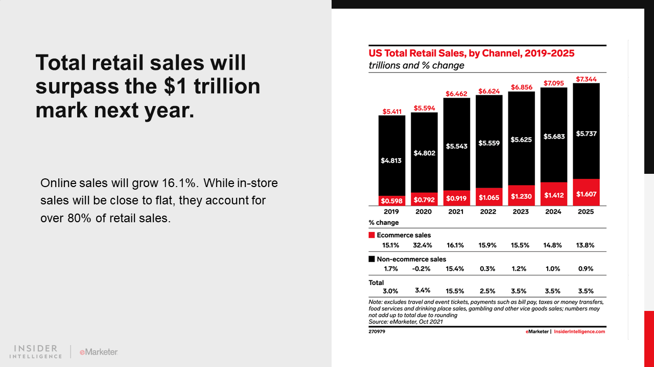 KEY STAT: Total US retail sales will increase 2.5% year over year (YoY) in 2022 to $6.624 trillion. Ecommerce sales will grow 16.1%, while growth for in-store sales—which will account for more than 80% of total retail sales—will be close to flat.