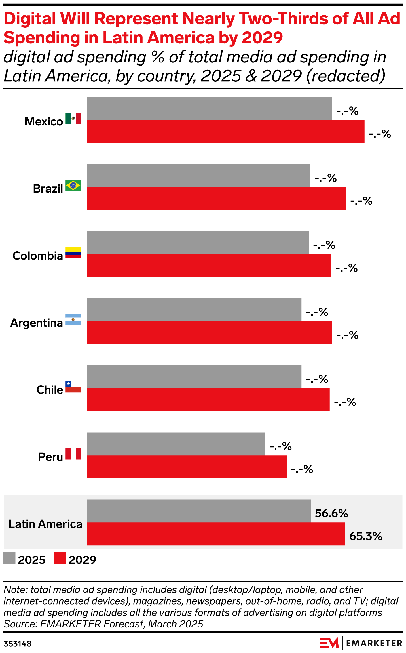 Key Stat: Digital will account for nearly two-thirds of total media spending in Latin America by 2029—up from 56.6% this year—driven by sustained double-digit growth in retail media, social media, and digital video.