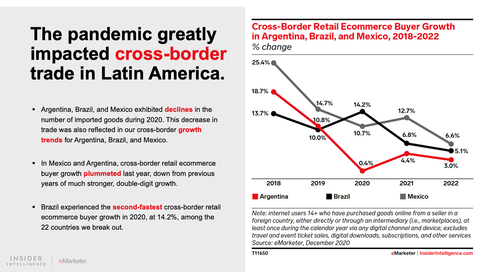 This report explores the pandemic’s impact on total retail, ecommerce, and mcommerce sales in Latin America, with breakouts for Argentina, Brazil, and Mexico. It also examines key drivers fueling regional market movements in 2021 and beyond.
