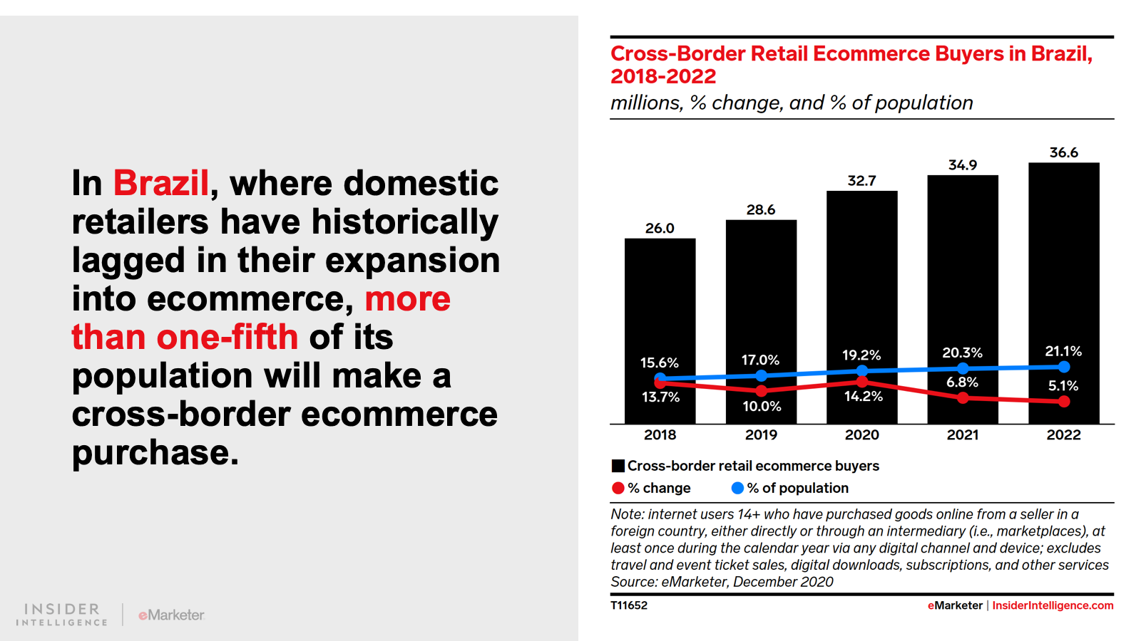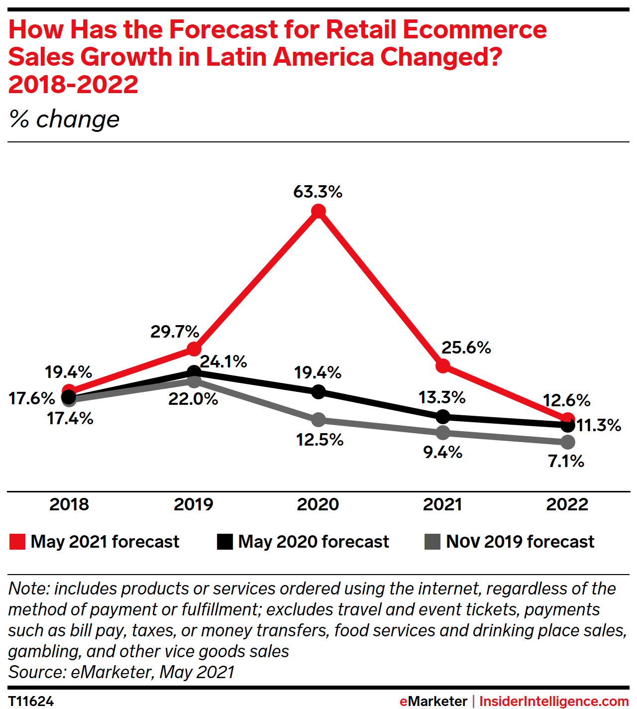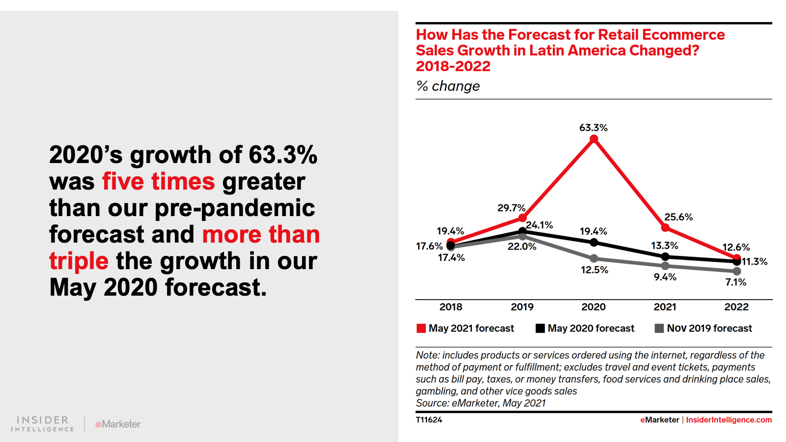 KEY STAT: Retail ecommerce sales in Latin America grew 63.3% in 2020 to $104.60 billion. This was five times greater than the 12.5% growth we estimated in our pre-pandemic November 2019 forecast and more than triple the 19.4% estimated growth in our May 2020 forecast.