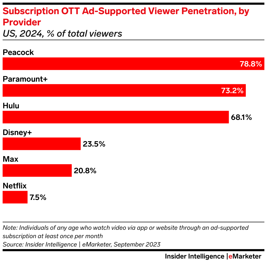 • The likelihood that viewers will choose an ad tier varies by platform. Over two-thirds of the viewership on Peacock, Paramount+, and Hulu will be ad-supported next year, according to our inaugural US ad-supported streaming viewers forecast. But after avoiding ads for more than a decade, Netflix is taking a cautious approach to shifting viewers over.