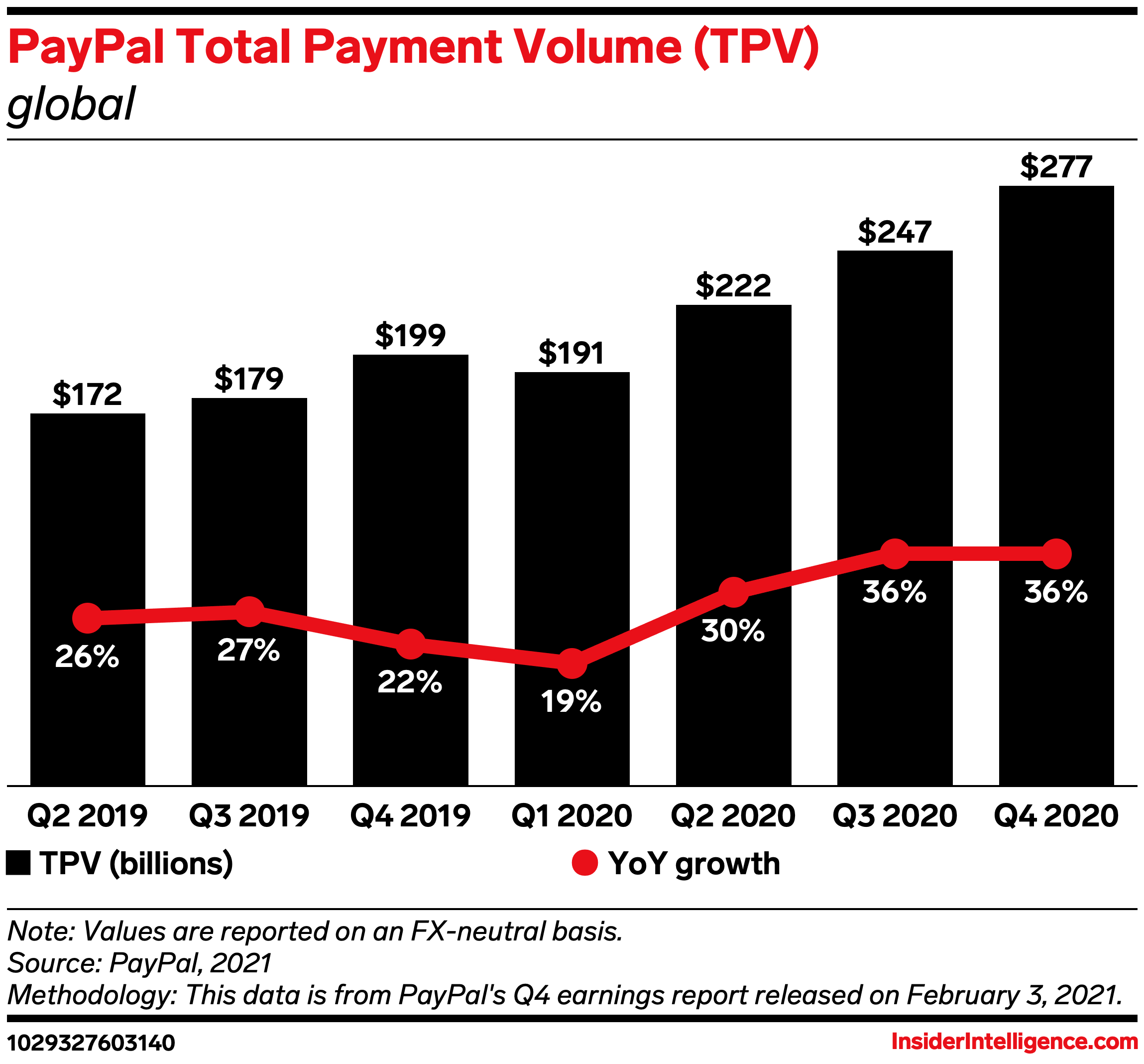 • The payments giant expects to reach 400 million global users by June, but it’s setting its sights on one day reaching 1 billion. In 2020, PayPal added 72.7 million net new accounts to reach a total of 377 million accounts globally, a 24% increase from 2019, when net new accounts increased by 37.3 million. Merchants were a driving force behind PayPal’s user growth thanks to its core products, from its one-click online checkout button to in-store innovations like its QR code payments, which helped meet consumer needs during the coronavirus pandemic. Indicative of merchant growth is PayPal’s merchant services volume, which grew 33% YoY, up from the 27% YoY growth it posted in 2019, suggesting that these offerings likely brought in new sellers.