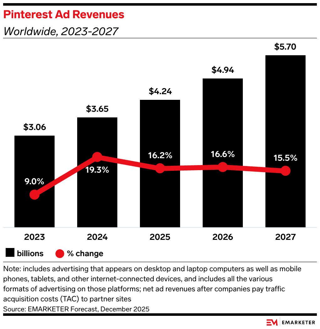 • Globally, Pinterest ad revenues are expected to grow from $4.24 billion in 2025 to $5.7 billion in 2027, showing improving monetization outside the US while overall user growth slows.