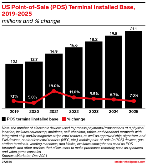 KEY STAT: The US POS terminal installed base will increase from 16.6 million this year—a substantive bump over pre-pandemic totals—to 21.1 million in 2025. But slowing growth means providers must focus on terminal replacement to drive sales, rather than new adoption.