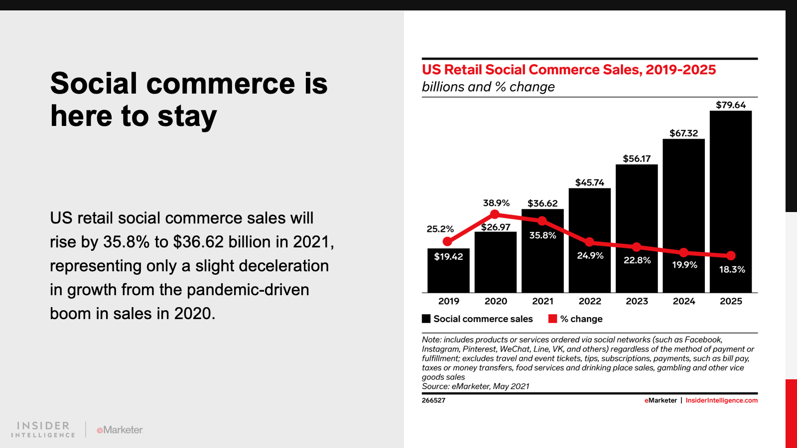 KEY STAT: US retail social commerce sales will reach $36.62 billion in 2021, but that’s still about one-tenth the size of China’s social commerce market.