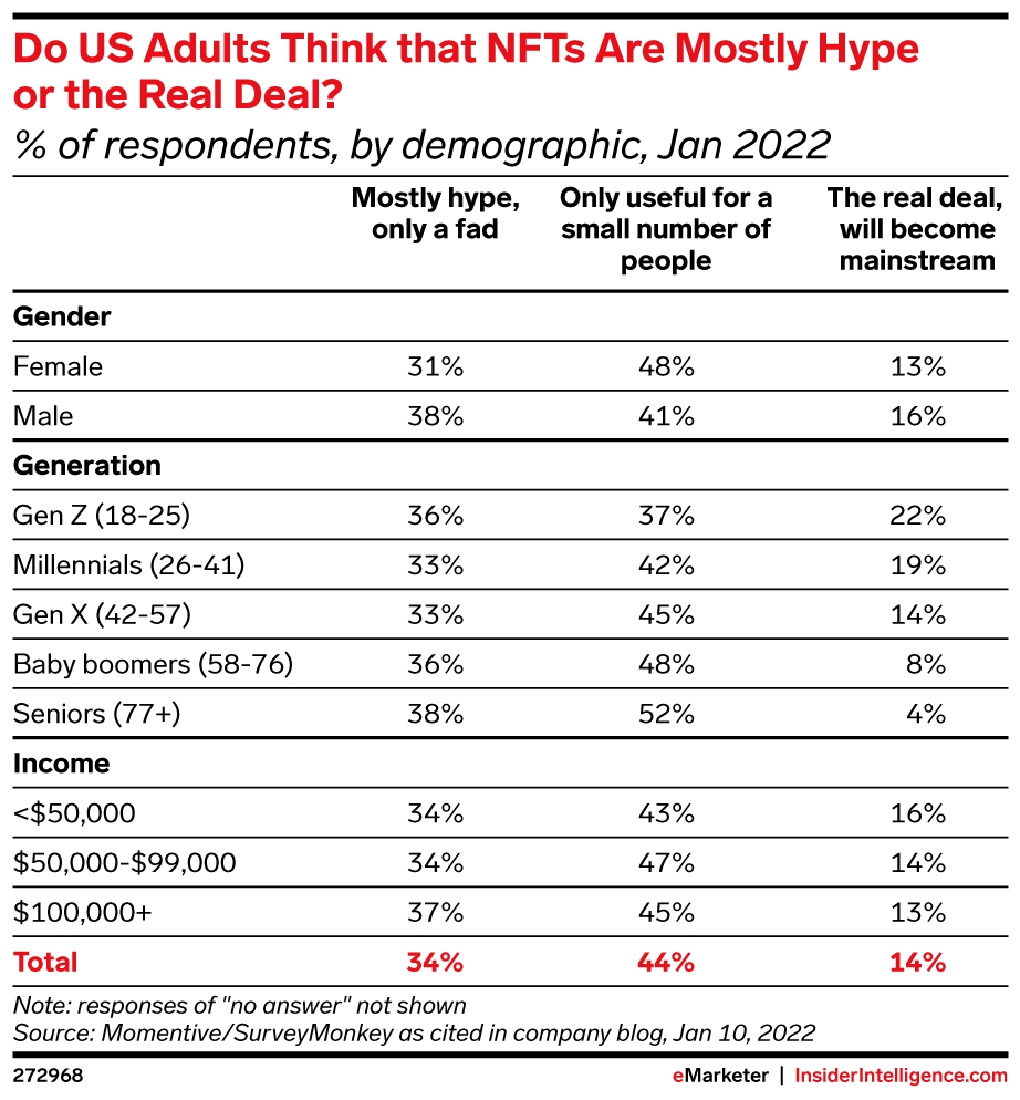 2. Public apathy: 41% of US adults have never heard of NFTs, according to YouGov, and just 3% of adults in Great Britain said they would feel more positively about a company if it started offering the digital tokens.