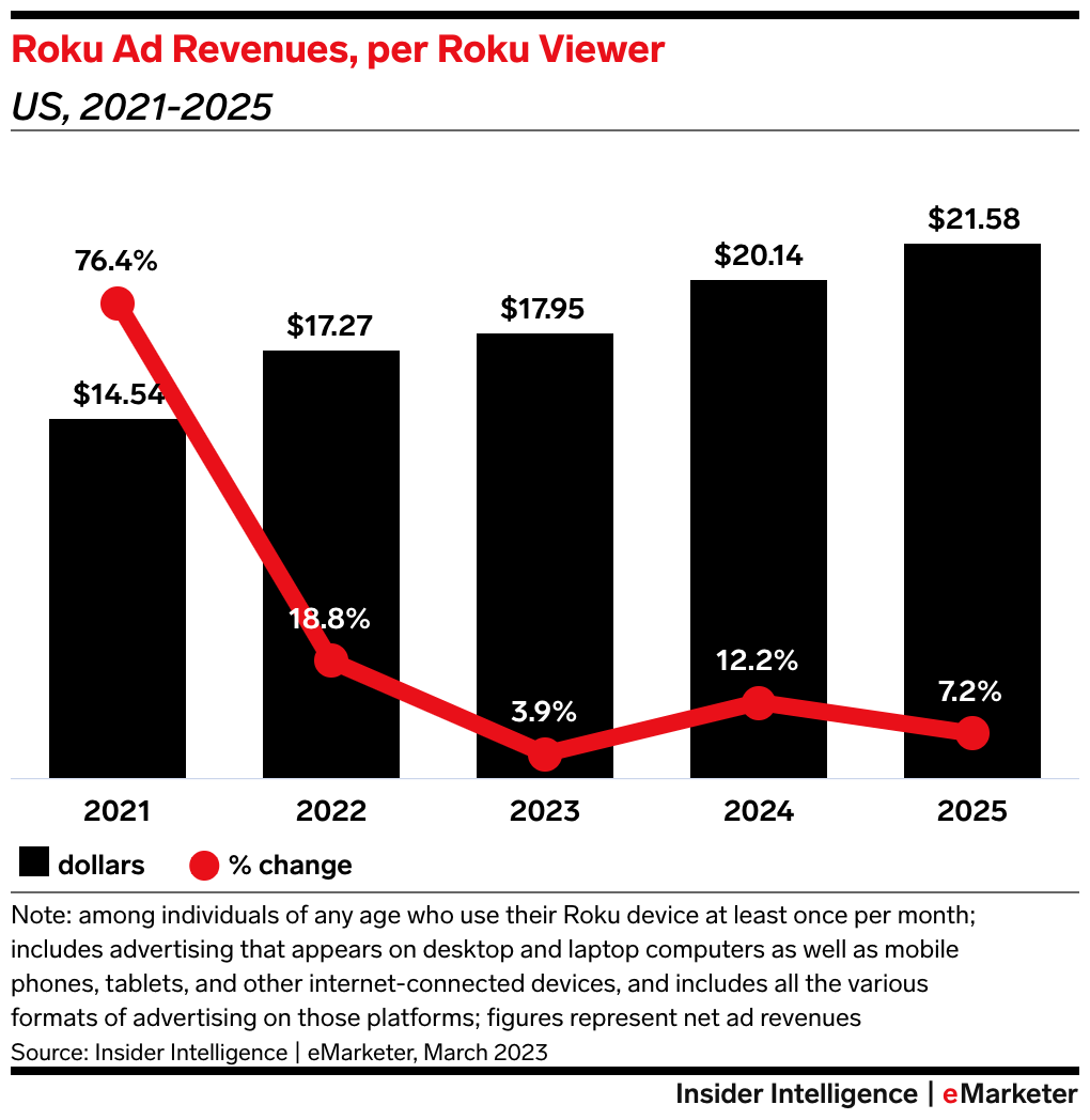 • On its earnings call, CFO Dan Jedda said the company expects "that over time, monetization per account will continue to grow as the advertising industry rebounds,” with US viewers playing an outsized role in that recovery. The US far outpaces other major markets in free ad-supported television (FAST) revenue growth and could achieve $9.76 billion by 2028.