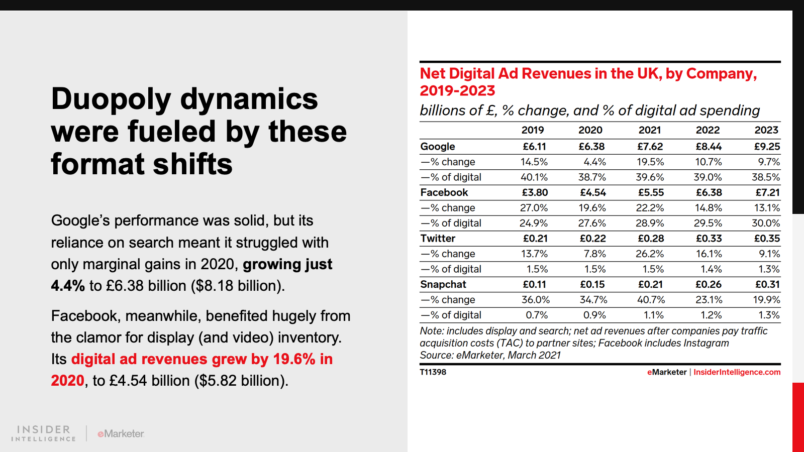 Digital display advertising, and particularly video, benefited from the pandemic. Search, on the other hand, struggled as some of the largest budget holders were forced to pull back spend (travel, for example). This has led to Facebook gaining some ground on Google in terms of the duopoly’s ad revenue share. This year, Google will account for 39.6% of total digital ad spend, and Facebook will account for 28.9%. In 2019, those proportions stood at 40.1% and 24.9%, respectively.