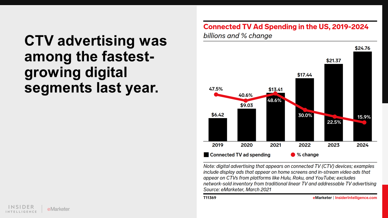 Within digital media, performance-oriented channels including social network advertising and ecommerce channel advertising held up well during the pandemic and will continue growing rapidly. Connected TV (CTV) advertising was also a beneficiary of pandemic trends, as linear TV decreased in importance and cord-cutting accelerated as more programmatic CTV inventory was becoming available than ever before.