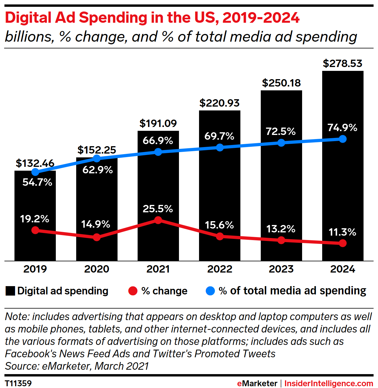 We forecast that US digital ad spending will increase 25.5% this year, the fastest growth rate since 2018, as the ad market and wider economy continue recovering from the pandemic. We estimate total media ad spending will rebound 18.0% this year after a flat 2020. That includes a 5.2% increase in traditional media ad spending, led by a partial recovery for TV.