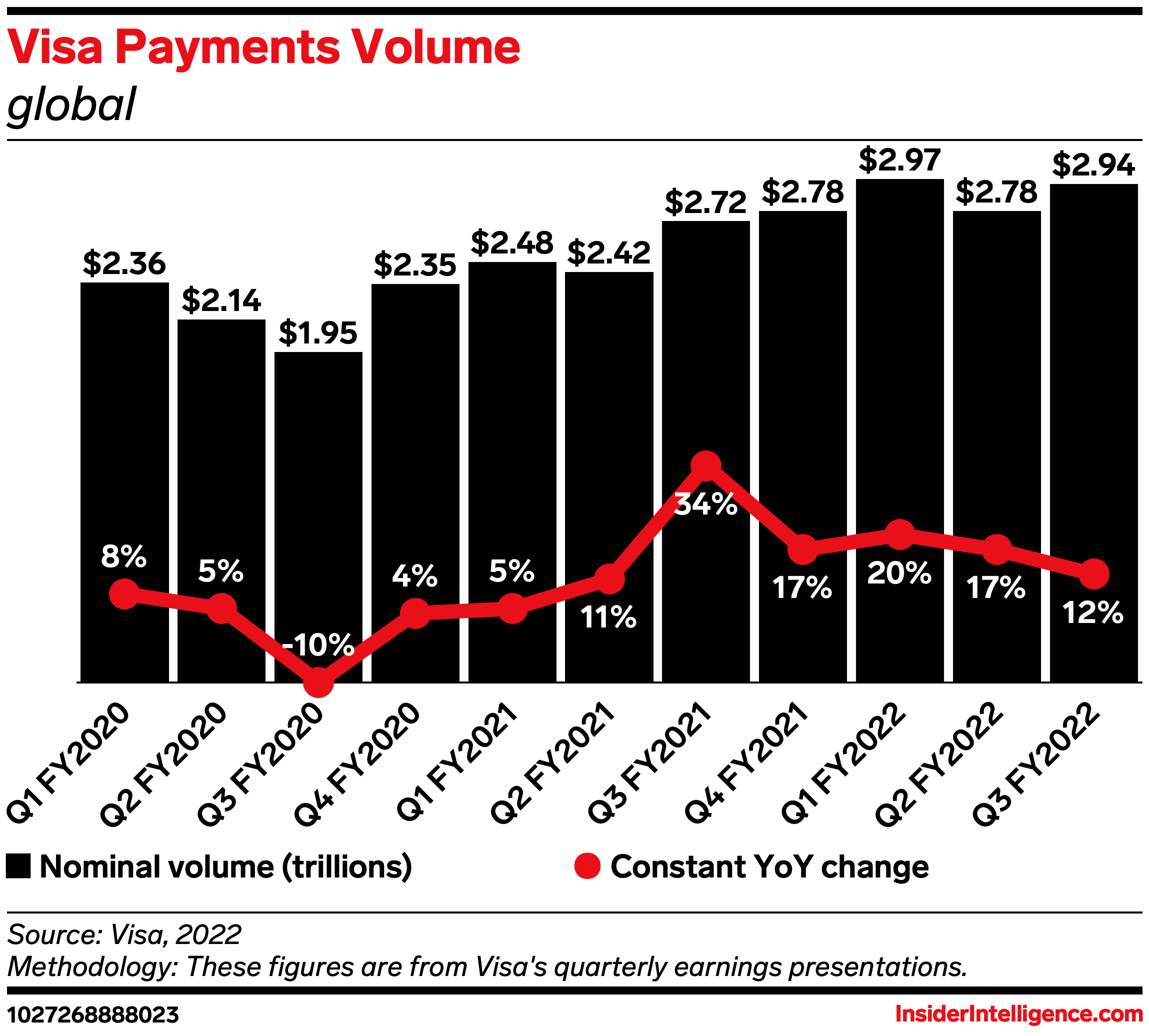 The data: Visa’s payments volume grew 12% year over year (YoY) in its fiscal Q3 2022 (ended June 30, 2022), per its earnings release.