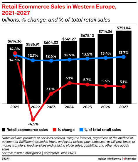 KEY STAT: After declining by 4.5% in 2022, ecommerce sales will grow by 3.0% to $604.33 billion across Western Europe in 2023. However, they will continue to lag overall retail sales.