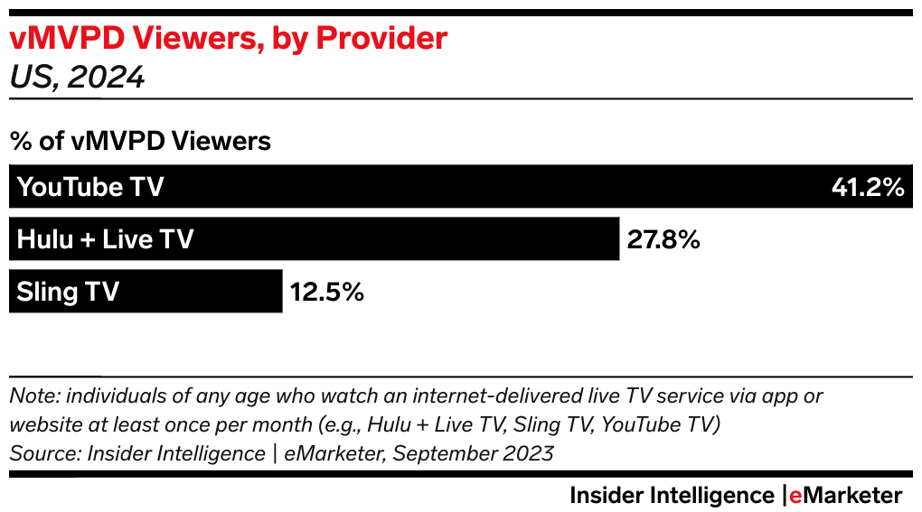 Key Stat: YouTube TV and Hulu + Live TV will account for more than two-thirds of digital pay TV viewers in 2024.
