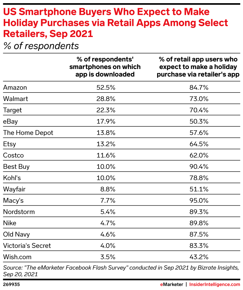 Our September 2021 holiday survey, conducted with Bizrate Insights, asked consumers which mobile retail apps they had downloaded on their smartphones and which apps they expected to use for holiday purchases. (While consumers tend to overstate future spending expectations in surveys, the relative percentages across retailers are useful directional indicators.)