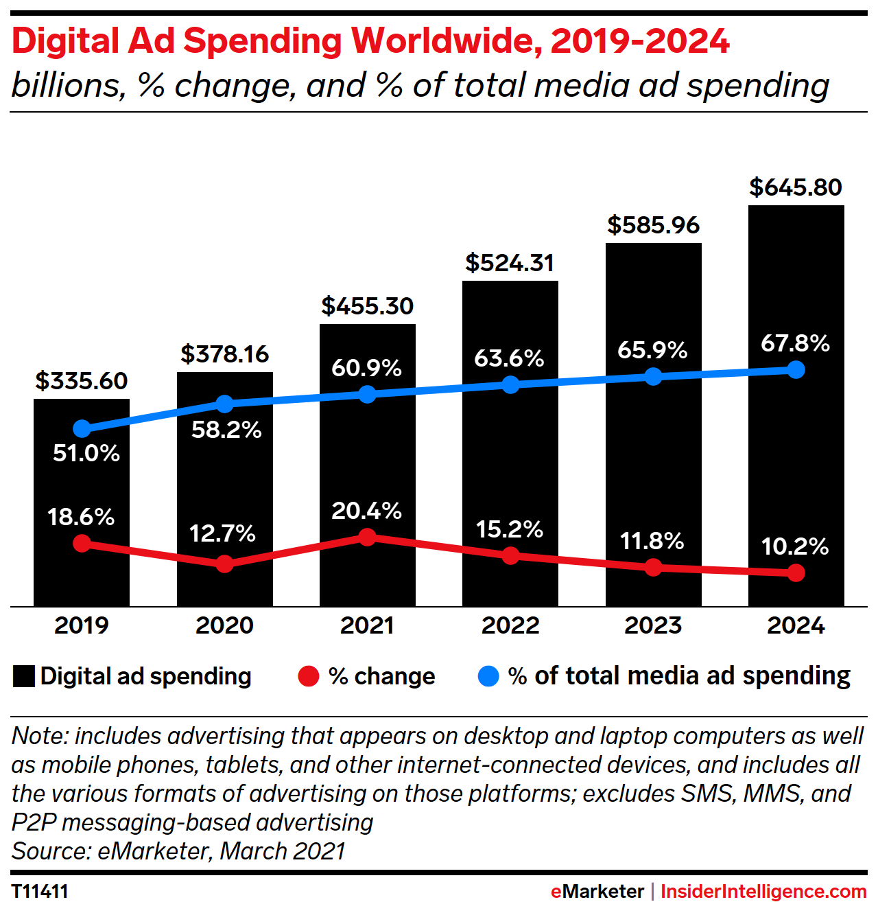 Despite historic economic disruptions, worldwide digital ad spending nearly matched our pre-pandemic forecast for 2020. In February 2020, we forecast 13.6% growth for digital ad spending worldwide for the year. The final figure was a very close 12.7%. However, total ad spending declined by 1.2%, driven by a 15.7% contraction in traditional ad spending.