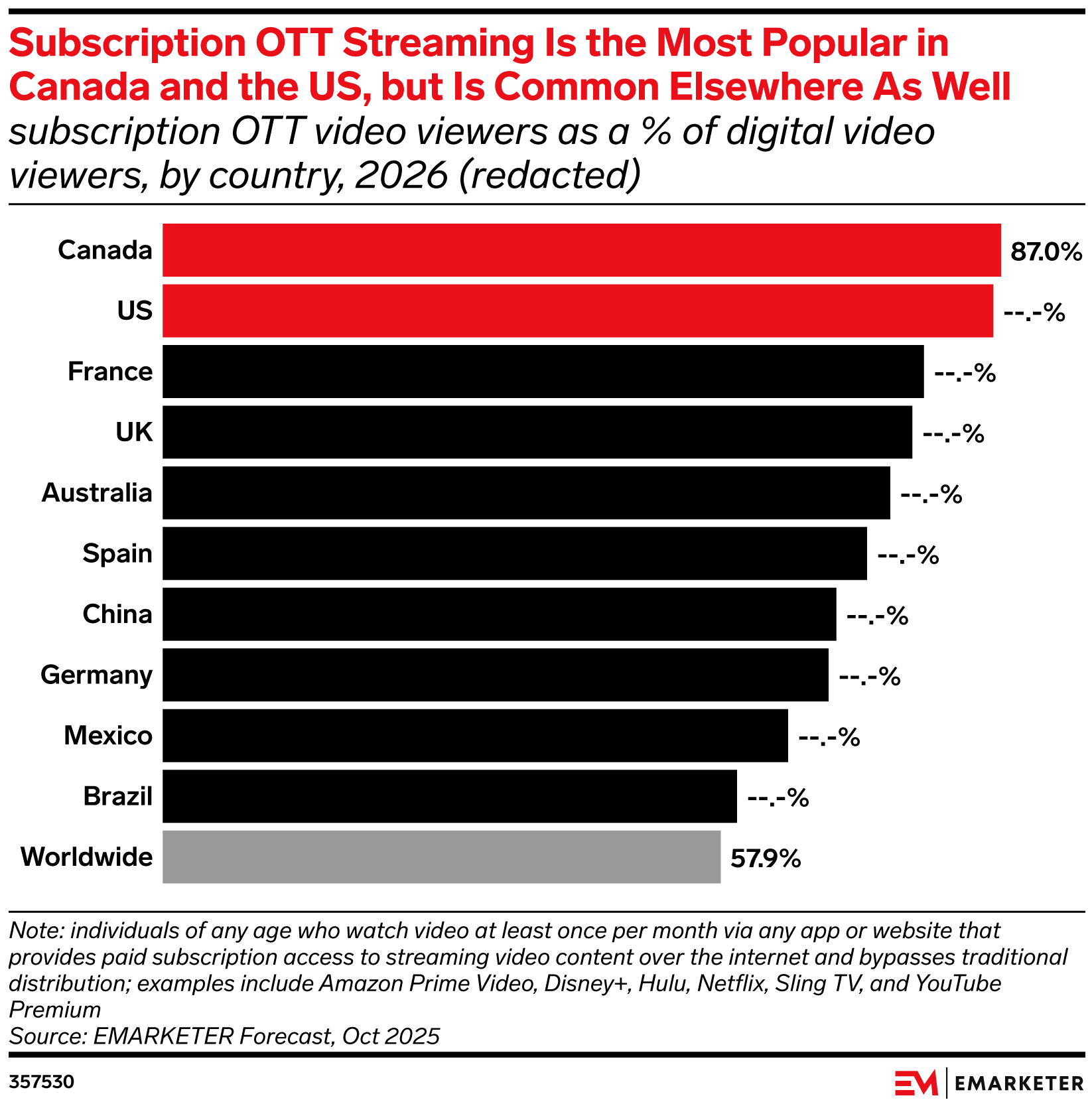 Key Stat: Nearly 58% of worldwide digital video viewers will watch sub OTT streaming services in 2026, but the share figure will be much higher than that in many major markets—with Canada leading at 87.0%.