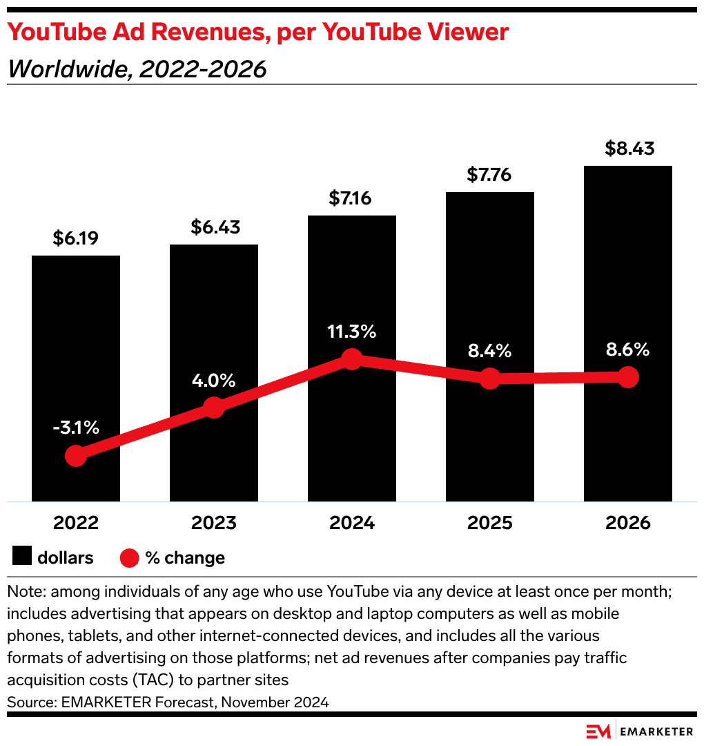 • Viewers may be more likely to stay engaged with less disruptive ads, which could help creators retain viewership—essential as ad revenues per YouTube viewer are increasing consistently.