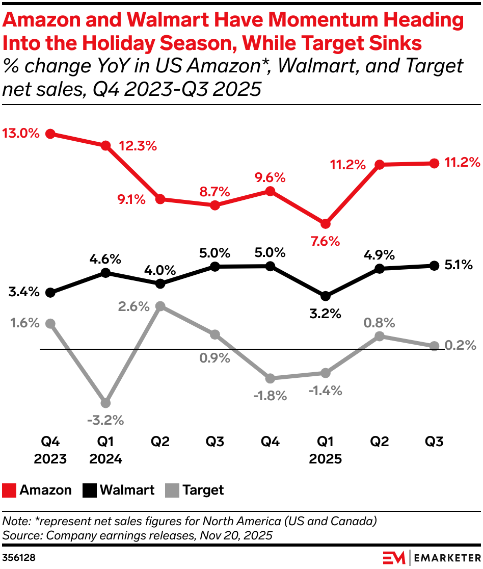 Q3 was another strong quarter for Walmart and Amazon, and another weak one for Target. Shoppers are showing a clear preference for the convenience, product selection, and overall value that Amazon and Walmart offer, while being less impressed by Target’s assortment and shopping experience. Economic uncertainty is heightening the gap, as more shoppers turn to Amazon and Walmart for necessities like groceries while pulling back on the discretionary spending that fuels Target. Walmart's and Amazon's ability to combine low prices with an extensive product selection and fast and convenient delivery will serve them well this holiday season, while Target has the harder task of convincing price-conscious shoppers to spend on nonessential items.