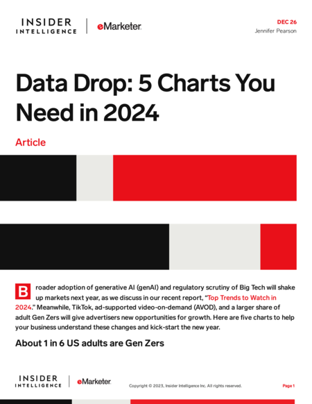 It’s a new year, which means new predictions. Our analysts have already made a number of big predictions for 2024, but here are a few more from our newsletter team. We’re keeping an eye on generative AI, attention metrics, and Gen Alpha—and we expect to see more ads in more places along the way. Here’s what we’re watching.